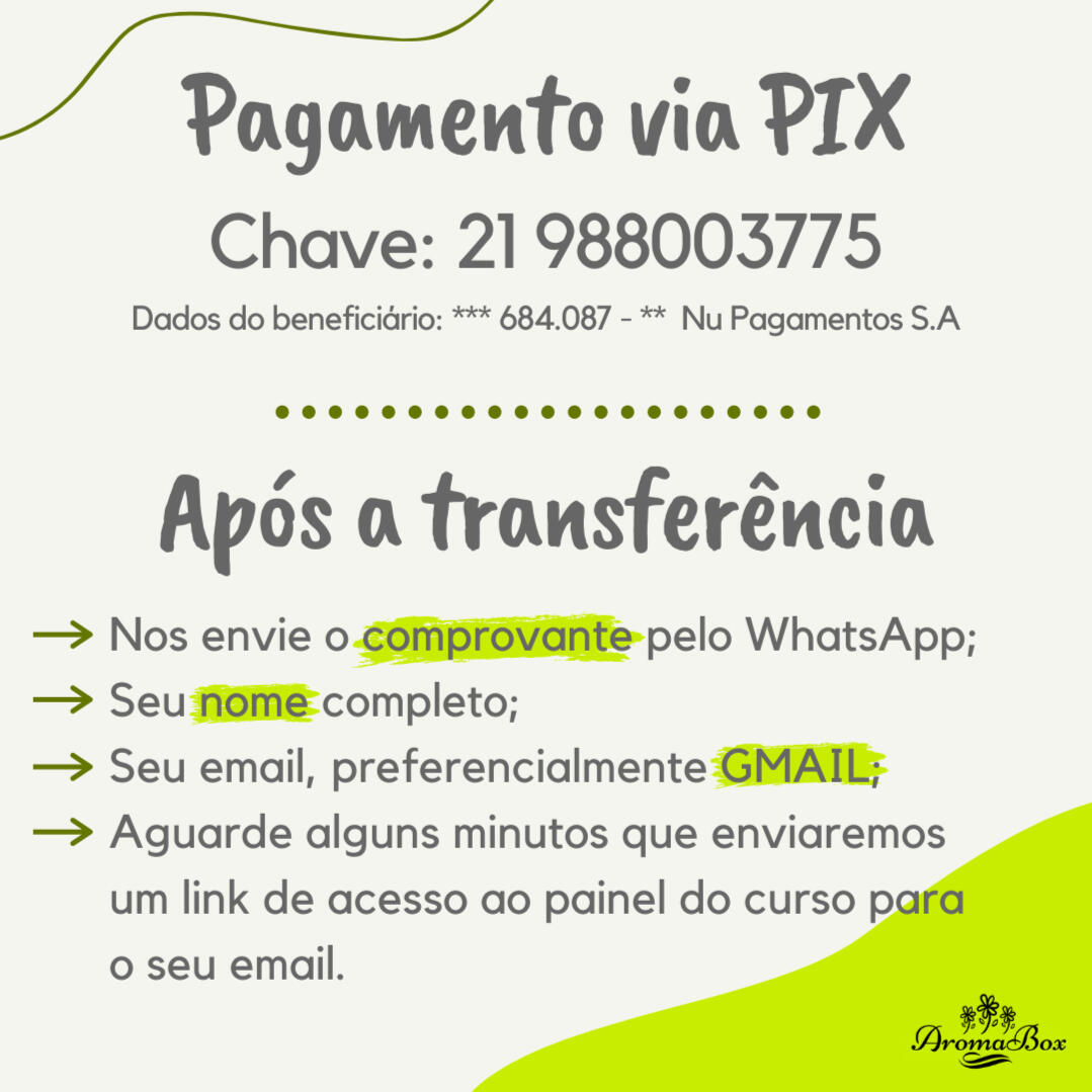 OBS: Para atendimento imediato realize pagamentos via PIX das 08:00h às 00:00hChave: 21 988003775ATENÇÃO: Após a realização do pagamento, clique no link abaixo e nos envie pelo whatsApp seu nome completo e email ( Gmail se possível ) para que possamos realizar sua matrícula.Com Gmail você poderá acessar pelo aplicativo Google sala de aula até quando estiver sem Internet.Hotmail, Bol, Yahoo e etc costumam bloquear o acesso ao Google sala de aula.